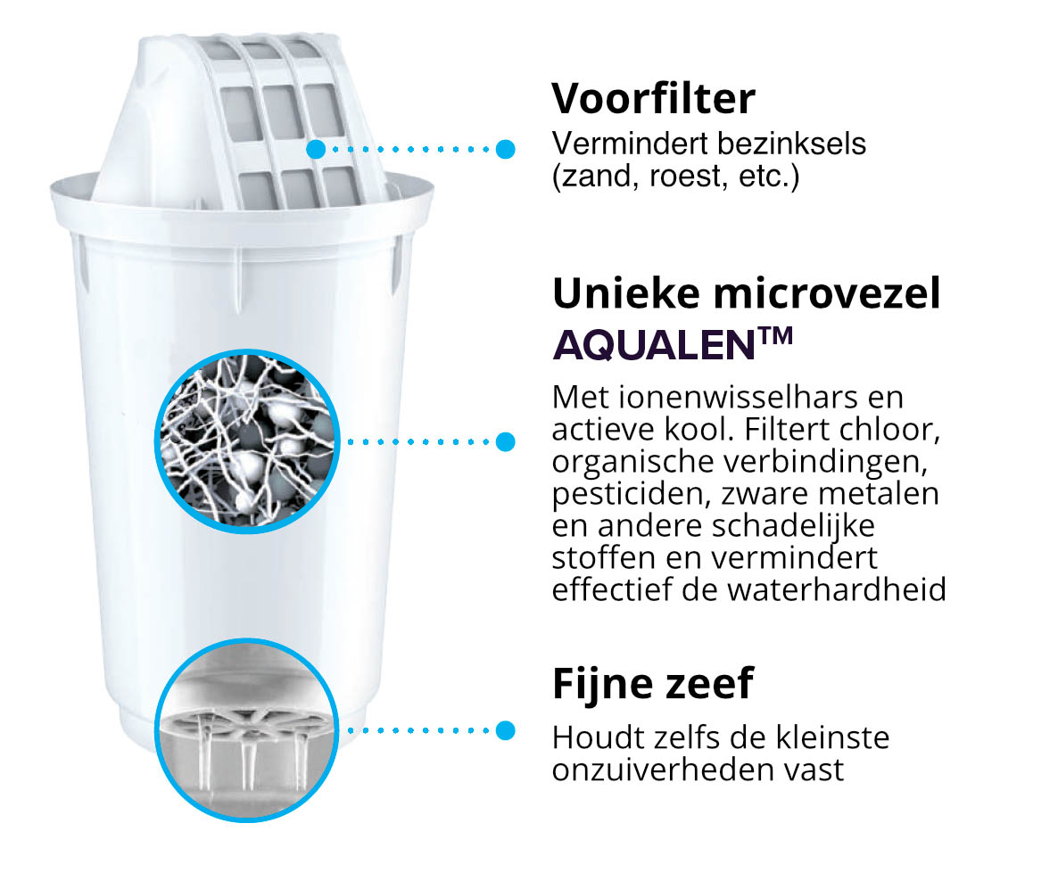 Samenstelling filter: Actieve koolstof, Ion-exchange hars, Aqualen vezels